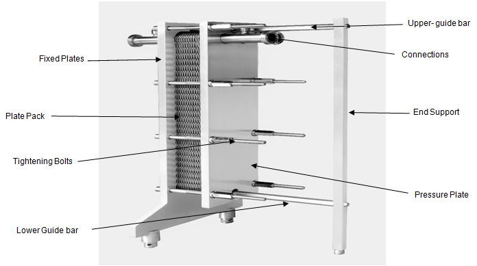 beenherePlate Pack : The plates are stacked together as per the design and holes type in order to achieve the proper heat transfer area. They are supported with top carrying bar and lower bar. The material of plates is of titanium, AISI SS 316 L / 304 L. The intermediate box is used to separate these plates into sections.