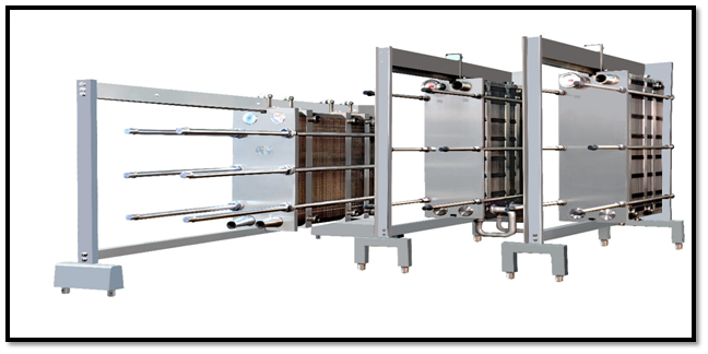 PLATE HEAT EXCHANGERS (PHE) : The selection of the heat exchanger depends on the products characteristics such as velocity, temperature, viscosity and particle size. The heat transfer is carried out on PHE by indirect method and in some applications direct. The PHE consist of stack of plates made from AISI SS 316 L / 304 L, or titanium where separate sections are divided for preheating, final heating, cooling and regeneration action. The plate is designed in a corrugated pattern, for the efficient heat transfer. The connections for heating medium like hot water or steam and cooling medium such as glycol, ice water and brine water are provided. The surface of the PHE is sealed with a Gaskets around the plate corners for preventing from leakage and internal mixing. The flow patterns are cross-flow or parallel flow depending on the product. The most important things we consider while designing the heat exchanger is, that we ensure product with efficient heat transfer as well as output with high quality result by giving desired texture and flavor.